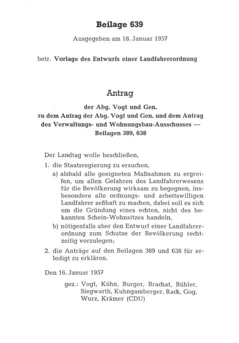 Vogt verdeutlichte seine Forderung nochmals im Januar 1957, als er und mittlerweile zehn CDU-Landtagsabgeordnete auf „geeignete Maßnahmen“ drängten, um „allen Gefahren des Landfahrerwesens für die Bevölkerung wirksam zu begegnen“. Gleichzeitig insistierten sie auf die Seßhaftmachung aller „ordnungs- und arbeitswilligen Landfahrer“, um gleichzeitig dem größten Teil der Gruppe Betrugsabsichten zu unterstellen.